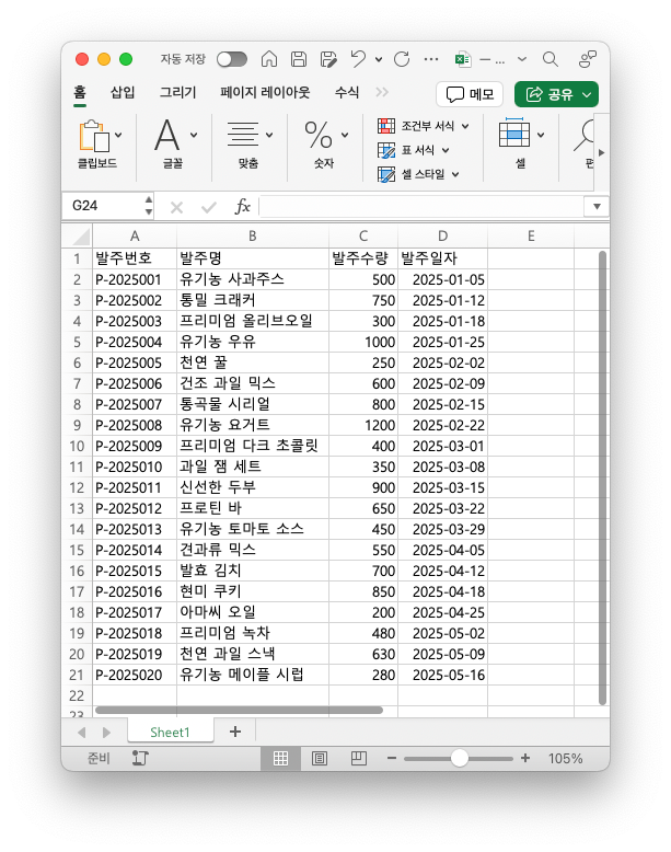 위 데이터에서 "발주일자" 컬럼으로부터 "발주년월" 컬럼을 생성하고 싶어요. 엑셀을 잘하시는 분이라면 수식을 입력해서 손쉽게 처리하시겠지만, "엑셀을 1도 모르시는 엑셀 초보자"는 어떤 네이버 검색이나 ChatGPT에게 물어보겠죠.