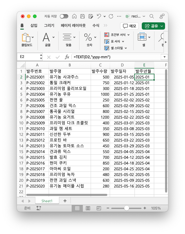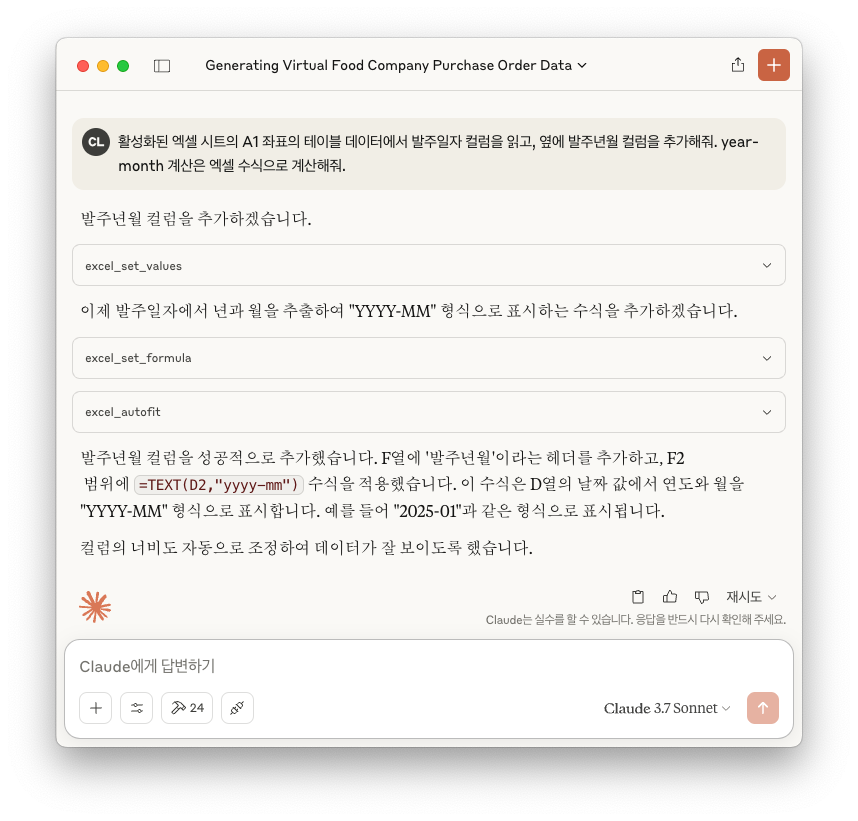 짠!!! 이렇게 "발주년월" 컬럼 데이터를 클로드가 알아서 생성해주었음을 확인하실 수 있습니다. 수식까지 기가 막히게 잘 들어갔어요. 🤩