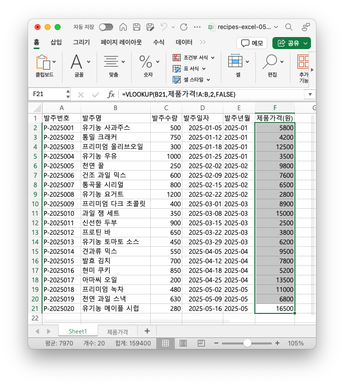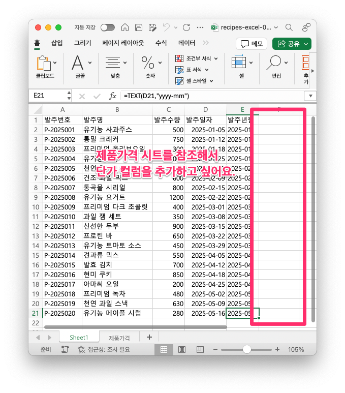 위 엑셀파일에서 "Sheet1" 시트에는 발주명에는 제품명이 기입되어있습니다. "제품가격" 시트를 참고해서 "단가" 컬럼을 추가하고 싶습니다.