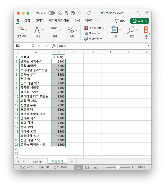 - 제품가격 시트의 데이터도 알아서 읽어가서 데이터를 확인한 후에