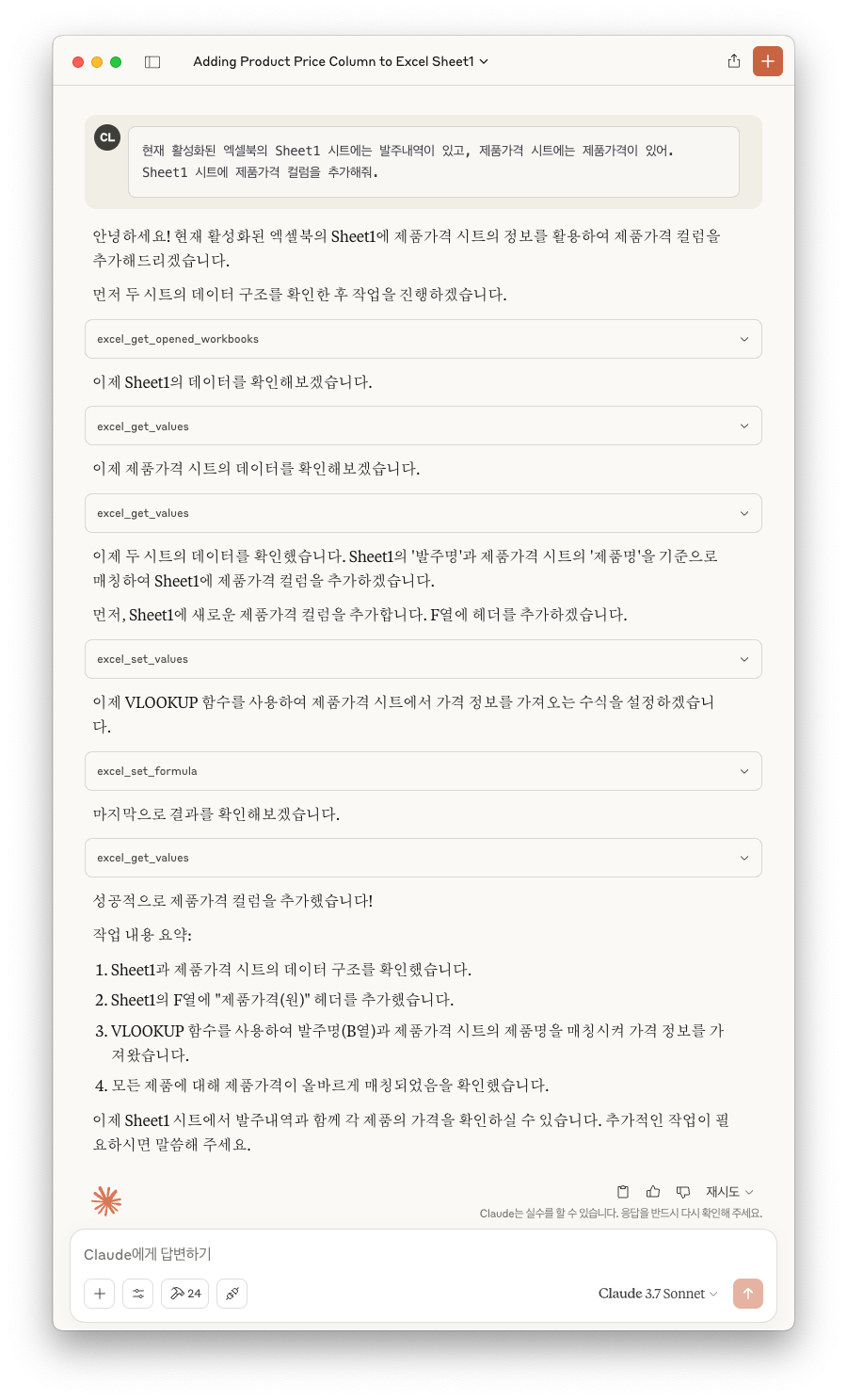- 어떤 엑셀 파일이라도 열려만 있다면 "클로드 + 파이썬사랑방 MCP 도구" 조합이 가능합니다.