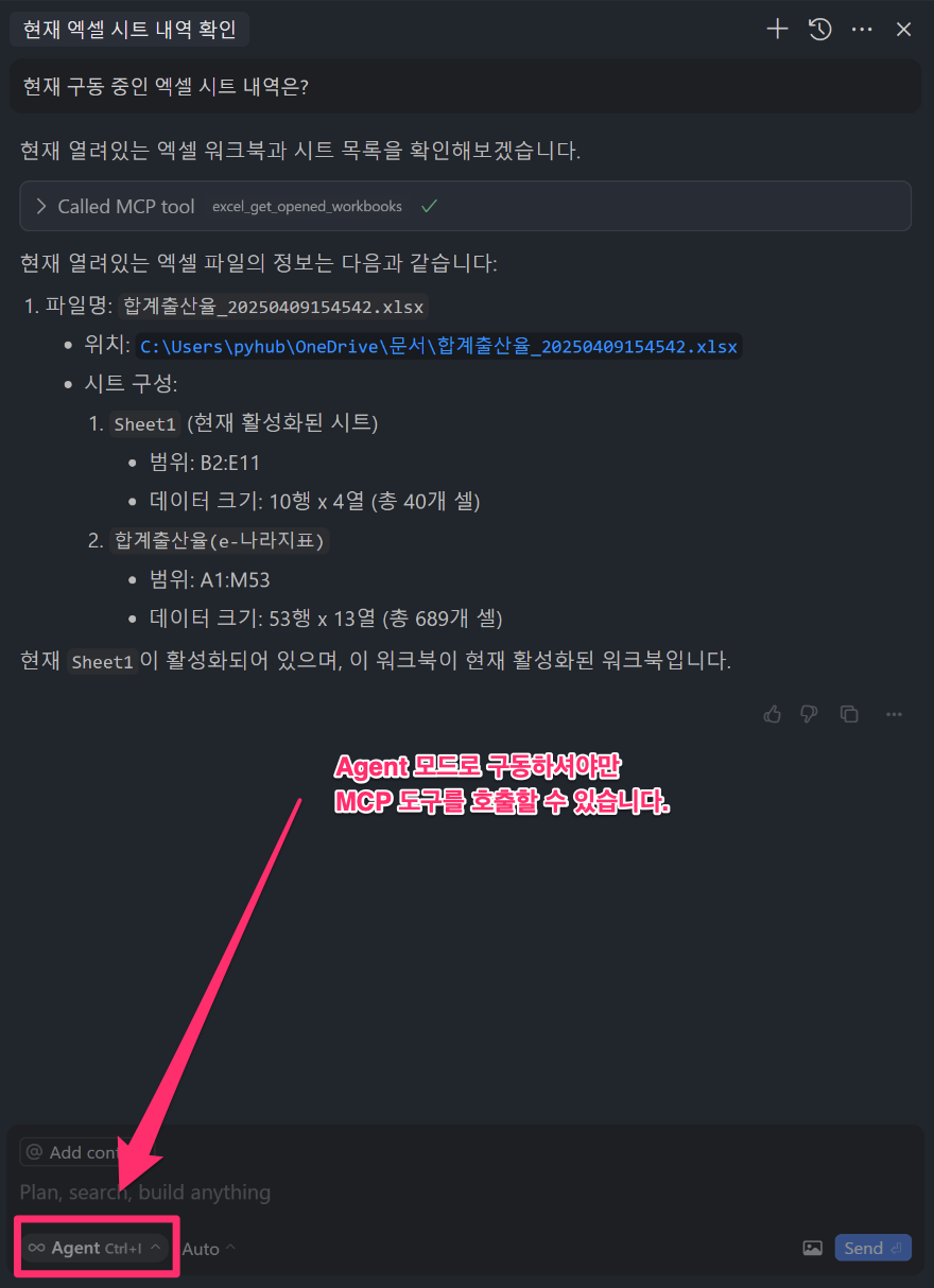 Agent 모드로 채팅하시면 아래와 같이 MCP 도구가 잘 호출이 됨을 확인하실 수 있습니다.