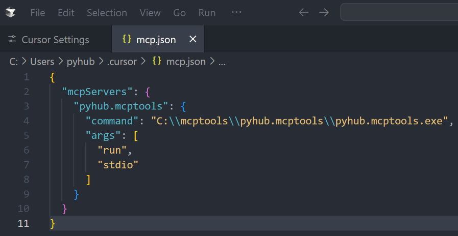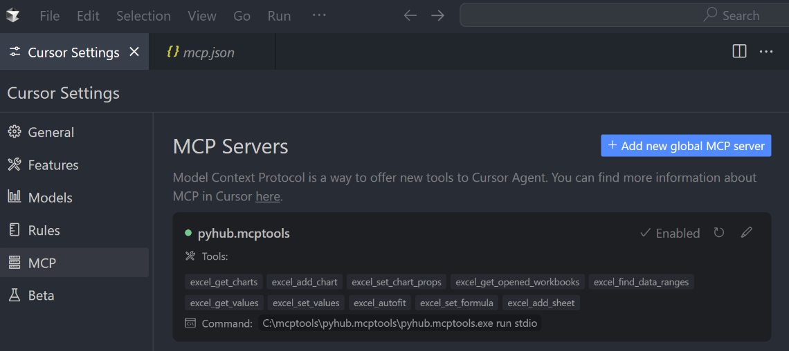 그럼 아래와 같이 Cursor MCP 설정 파일에 자동으로 추가되구요.